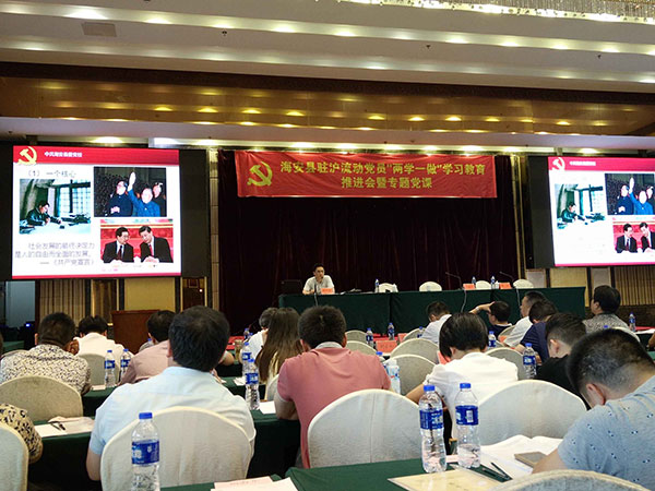 同時,根據(jù)縣委組織部對“兩學(xué)一做”教育活動的工作安排,“聯(lián)合黨委”于5月19日下午舉行“兩學(xué)一做”教育活動專題黨課?!奥?lián)合黨委”書記李忠澤作“兩學(xué)一做”動員報告,海安縣委黨校常務(wù)副校長徐進、副校長程衛(wèi)國分別作“學(xué)習(xí)黨章、學(xué)習(xí)系列講話”專題黨課,海安籍在滬流動黨員近400人參加活動。