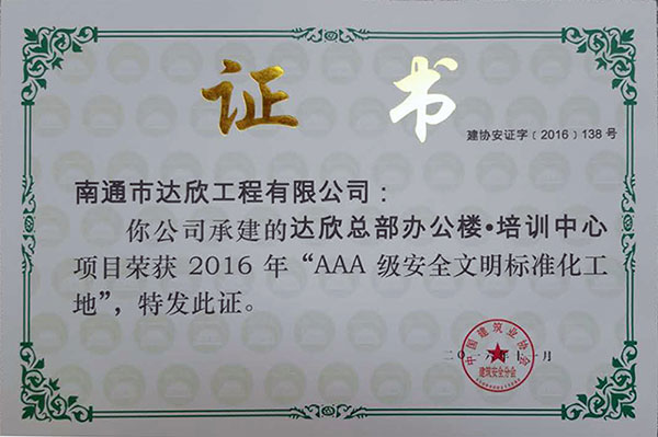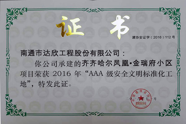 近幾年我公司獲得全國AAA級安全文明標準化工地23項,創(chuàng)建面涉及上海、江蘇、河北、黑龍江、湖南、新疆等市場,榮譽的取得為進一步提升達欣在全國各個市場的影響力,促進企業(yè)健康發(fā)展奠定堅實的品牌基礎(chǔ)。
