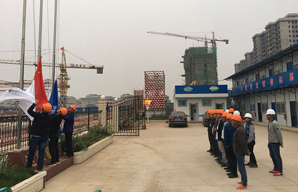 清晨,朝陽初升。項目辦公區(qū)前,一群充滿活力年輕人引吭高歌《中華人民共和國國歌》,鮮艷的五星紅旗和印著達(dá)欣徽標(biāo)的白、藍(lán)旗幟,在微風(fēng)中徐徐升起。