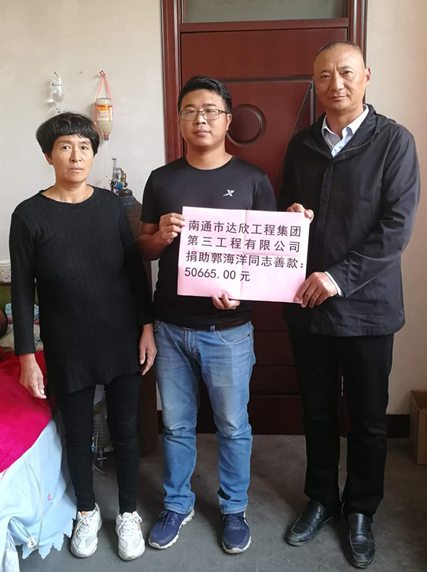 第三工程公司黨支部書記陳仁富經(jīng)常:“愛心無小事,樂善好施,扶貧幫困”是達(dá)欣人的傳統(tǒng)美德。在知曉情況后,立即發(fā)出愛心倡議。黨員們積極帶頭,全體員工紛紛伸出充滿愛心之手,將50665元善款在第一時間送到郭海洋及家人手里。