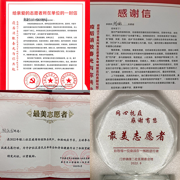 近日,公司陸續(xù)收到來自中共上海市虹口區(qū)四川北路街道工作委員會(huì)、街道辦事處、新冠疫情防控工作領(lǐng)導(dǎo)小組對(duì)集團(tuán)第一工程公司廣大職工、第八工程公司劉旭,以及中共嘉定區(qū)江橋鎮(zhèn)綠二社區(qū)對(duì)第八工程公司倪慶龍,在上海疫情期間,積極投身社區(qū)疫情防控志愿服務(wù),不懼風(fēng)雨、不辭辛苦,始終堅(jiān)守助力打贏上海疫情阻擊戰(zhàn)的基層戰(zhàn)場(chǎng),所展現(xiàn)出的大愛、擔(dān)當(dāng)、奉獻(xiàn)精神,表示感謝和慰問。倪慶龍獲得“最美志愿者”稱號(hào)。