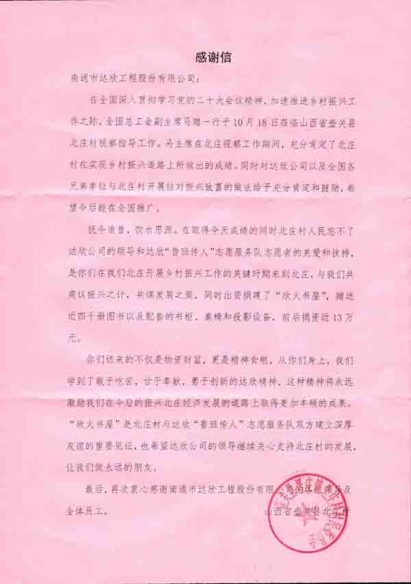 元月9日,公司收到來自山西省壺關(guān)縣北莊村村委會黨支部寄來的錦旗和感謝信,對集團(tuán)在助力北莊村鄉(xiāng)村建設(shè)、鄉(xiāng)村振興、鄉(xiāng)村致富等方面所給予的關(guān)愛和扶持表示感謝。