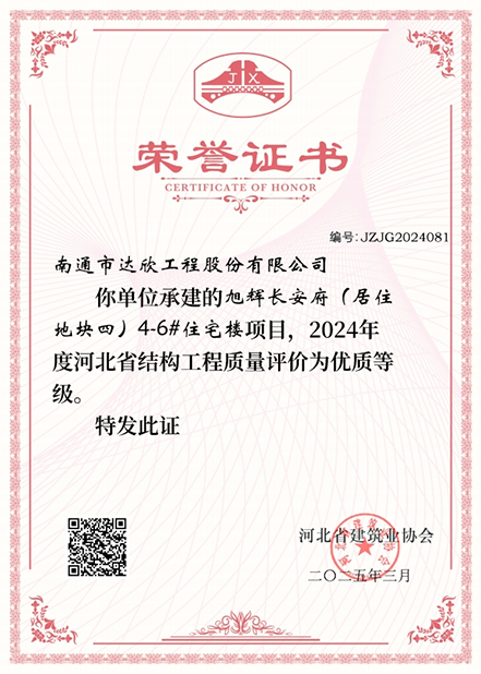 近日,第四工程公司承建的旭輝長(zhǎng)安府(居住地塊四)項(xiàng)目憑借卓越的施工質(zhì)量和過(guò)硬的工程品質(zhì),在 2024 年度河北省結(jié)構(gòu)工程質(zhì)量評(píng)價(jià)中脫穎而出,榮獲優(yōu)質(zhì)等級(jí)證書(shū)。這一殊榮不僅是對(duì)項(xiàng)目團(tuán)隊(duì)辛勤付出的高度認(rèn)可,更是第四工程公司在工程質(zhì)量領(lǐng)域的一次重要突破與里程碑。