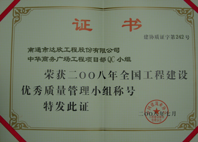 2008年7月6日,由中國建筑業(yè)協(xié)會組織的2008年度全國工程建設優(yōu)秀質量管理(QC)小組活動成果發(fā)布會在廣西桂林落下帷幕,我公司中華商務廣場工程項目部QC小組作為河北省推薦的十二個省級QC小組之一參加了會議并榮獲全國工程建設優(yōu)秀QC小組。這是我公司以“達欣”品牌獲得的第一項國家級 QC成果獎。