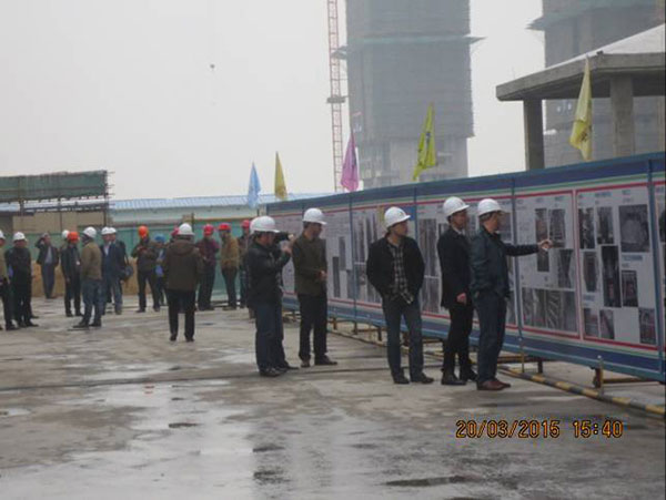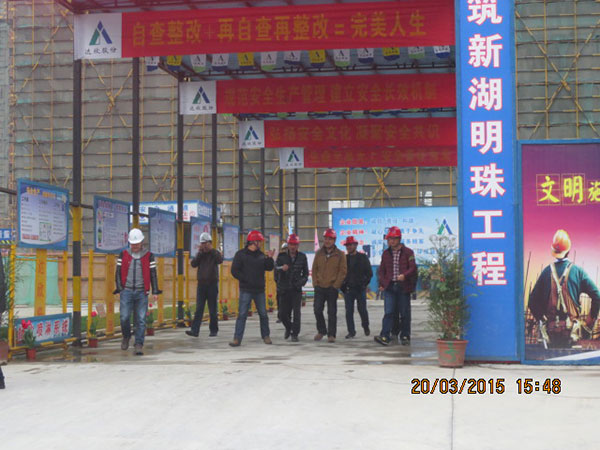 施工現(xiàn)場,項(xiàng)目經(jīng)理崔益明就工程概況、文明工地創(chuàng)建采取的措施、質(zhì)量管理方面新工藝、新材料革新以及采用樣板引路所取得的成效向來訪嘉賓作了詳細(xì)介紹??疾旒钨e們一行先后參觀了11#、12#地塊現(xiàn)場文明施工、樣板展示區(qū)、結(jié)構(gòu)實(shí)體工程,對該項(xiàng)目部施工生產(chǎn)、安全質(zhì)量、現(xiàn)場文明等方面給予了高度評價(jià)。蘇州新湖置業(yè)王總表示希望在蘇州區(qū)域保持良好持久合作的基礎(chǔ)上,將積極推薦我司參與新湖中寶其他區(qū)域公司的項(xiàng)目合作。